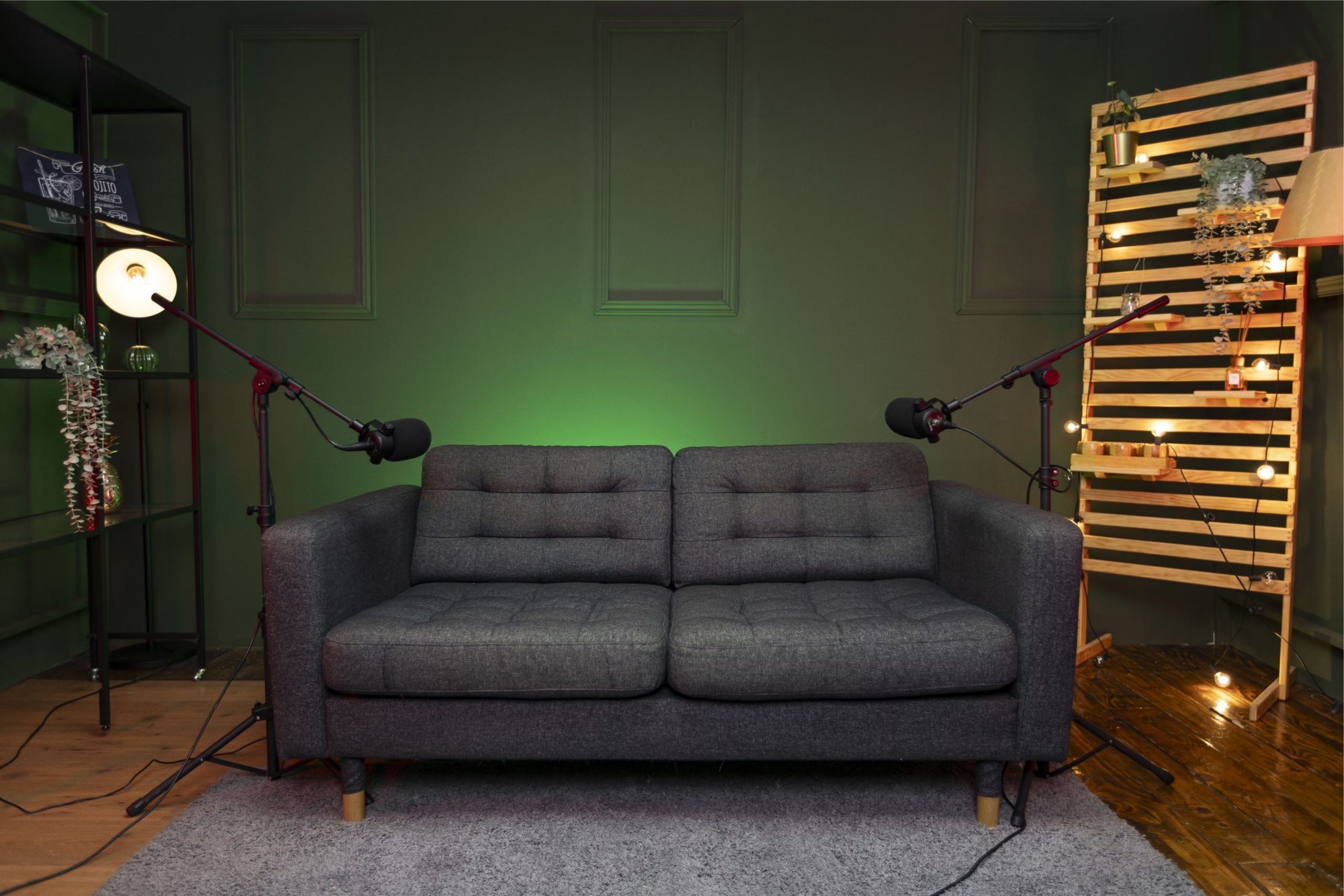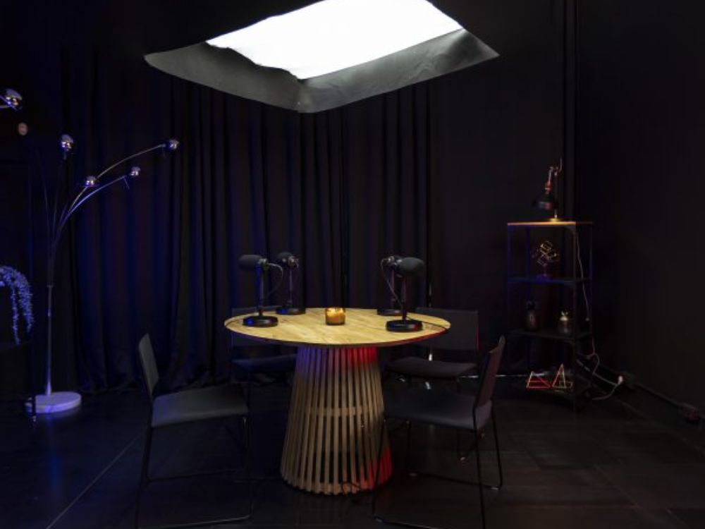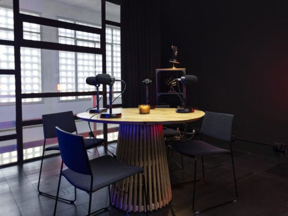 Espacio equipado con todo lo necesario para grabar tu podcast con calidad profesional: cabina insonorizada, audio optimizado e iluminación lista para utilizar.
