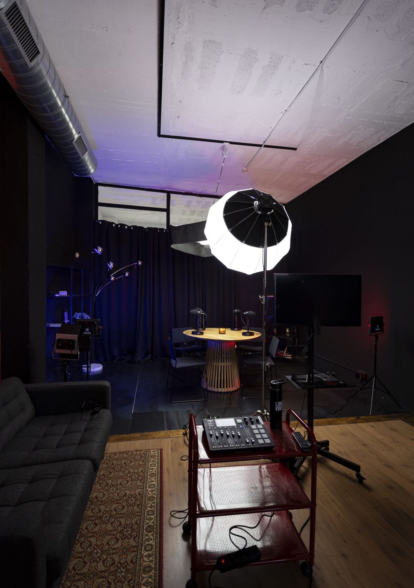 El ambiente es neutro, bien iluminado y cómodo para cámaras, ya sea que grabes solo o con invitados.
