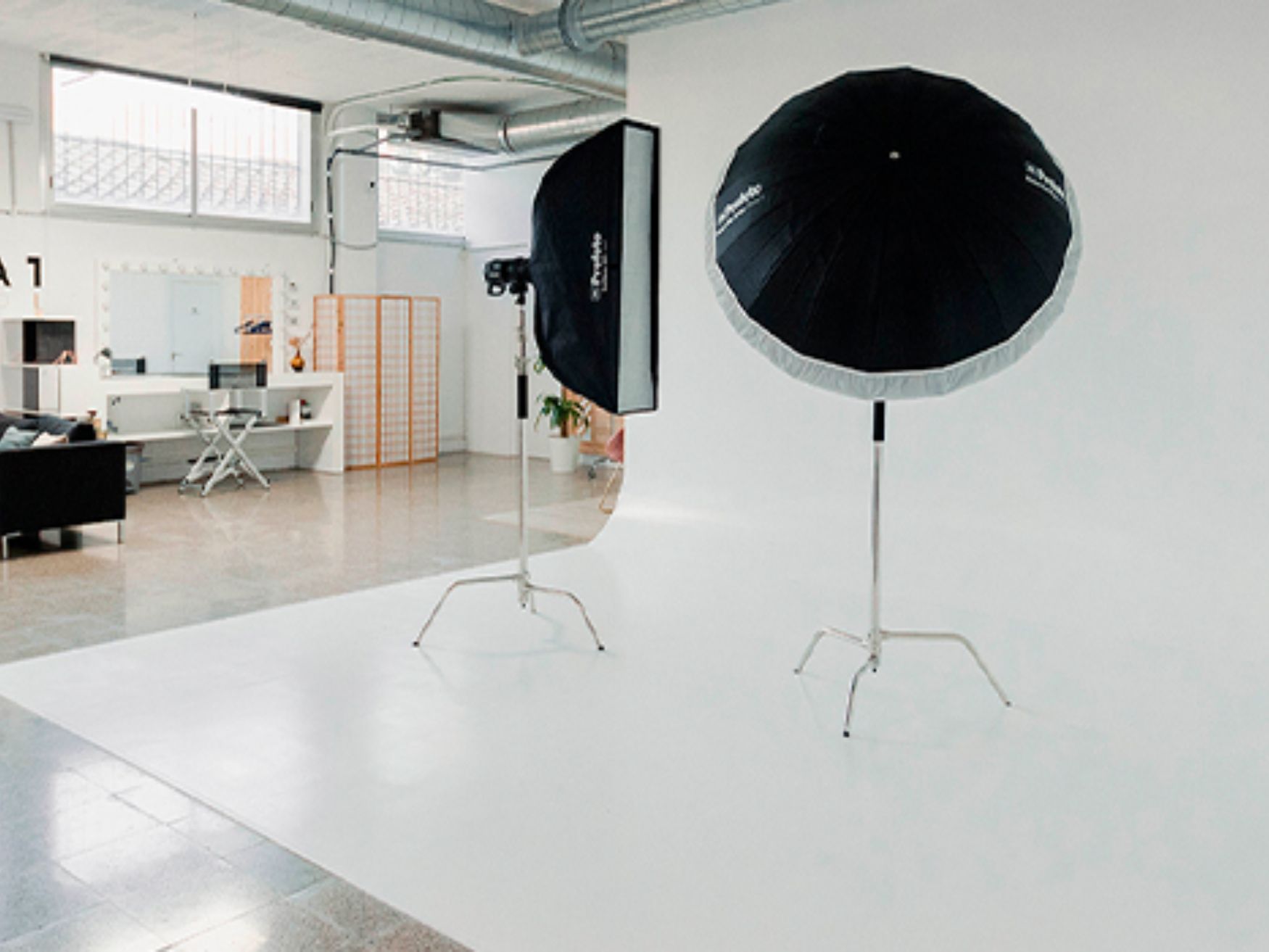 El alquiler del estudio incluye el uso del ciclorama, corriente eléctrica, focos LED básicos, acceso al office, aire acondicionado frÃo/calor, zona de vestuario, sala de maquillaje y mobiliario auxiliar. Si necesitas material de iluminación adicional o fondos de papel de colores, puedes solicitarlo con anticipación.